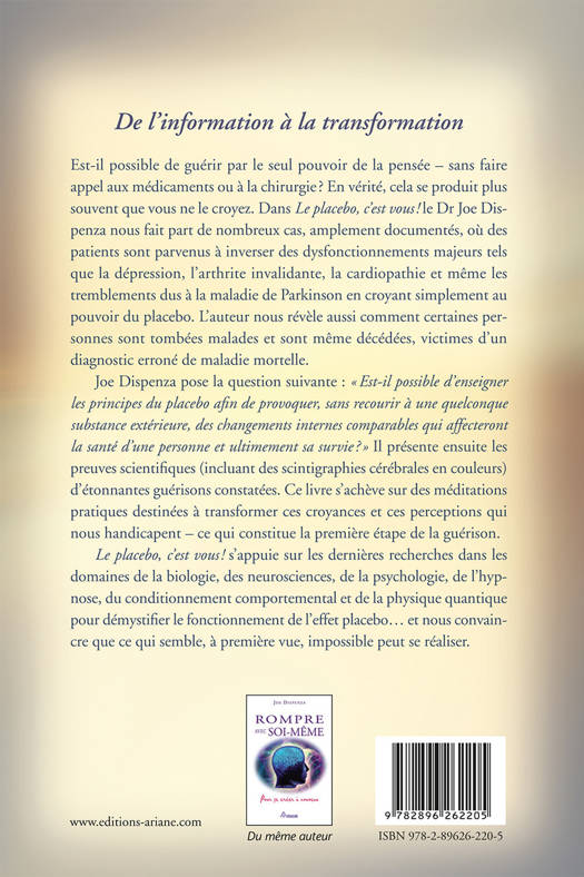 Est-il possible de guérir par le seul pouvoir de la pensée - sans faire appel aux médicaments ou à la chirurgie ? Cela se produit plus souvent que vous ne le croyez. Dans ce livre, le Dr Joe Dispenza nous fait part de nombreux cas, amplement documentés, où des patients sont parvenus à inverser des dysfonctionnements majeurs tels que la dépression, l'arthrite invalidante, la cardiopathie et même les tremblements dus à la maladie de Parkinson en croyant simplement au pouvoir du placebo. L'auteur nous révèle aussi comment certaines personnes sont tombées malades et sont même décédées, victimes d'une sorte d'envoûtement ou après avoir reçu un diagnostic erroné de maladie mortelle. « Le placebo c'est vous » s'appuie sur les dernières recherches dans les domaines de la biologie, des neurosciences, de la psychologie, de l'hypnose, du conditionnement comportemental et de la physique quantique pour démystifier le fonctionnement de l'effet placebo…