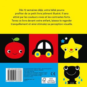Dès 12 semaines déjà, votre bébé pourra profiter de ce livre cartonné joliment illustré. Il sera attiré par les couleurs vives et les contrastes forts. Tenez ce livre devant votre enfant, laissez-le regarder tranquillement et ainsi stimulez sa perception visuelle. Dès 12 semaines.