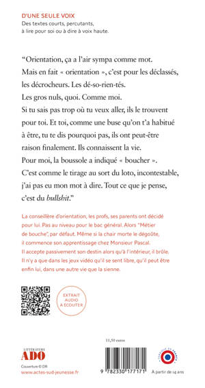 "Orientation, ça a l'air sympa comme mot. Mais en fait « orientation », c'est pour les déclassés, les décrocheurs. Les dé-so-rien- tés. Les gros nuls, quoi. Comme moi. Si tu sais pas trop où tu veux aller, ils le trouvent pour toi. Et toi, comme une buse qu'on t'a habitué à être, tu te dis pourquoi pas, ils ont peut-être raison finalement. Ils connaissent la vie. Pour moi, la boussole a indiqué « boucher ». C'est comme le tirage au sort du loto, incontestable, j'ai pas eu mon mot à dire. Tout ce que je pense, c'est du bullshit."