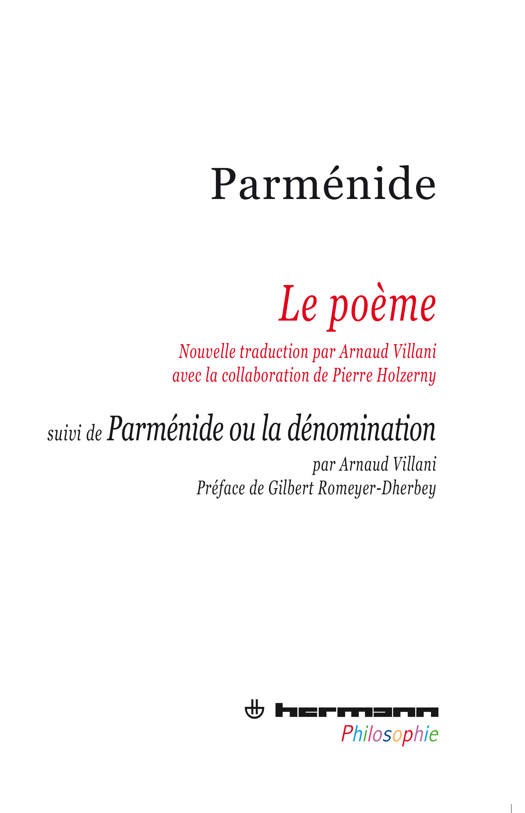 Nouvelle traduction par Arnaud Villani avec la collaboration de Pierre Holzerny suivi de Parménide ou la Dénomination par Arnaud Villani Préface de Gilbert Romeyer-Dherbey Et si, tout compte fait, Parménide ne présentait pas du tout la figure traditionnelle qu'on lui prête ? Et s'il n'était pas le logicien du principe d'identité que l'on croit ? Et si l'Être était un « tenir ensemble » et la Sphère un monde bien tenu, respectant la Vérité de la Déesse sans exclure en rien le Sensible ? C'est ce qu'Arnaud Villani tente d'établir dans une traduction et un commentaire préfacés par Gilbert Romeyer-Dherbey, et qui privilégient une piste de lecture oubliée.