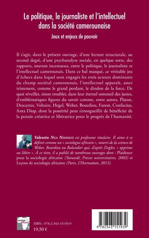 Cet ouvrage essaie de décrypter trois groupes sociaux importants, voire déterminants, du champ sociétal camerounais. Il s'agit des microcosmes politique, journalistique et intellectuel qui entretiennent des relations, souvent incestueuses et hideuses, mais inconscientes et solides. Il proposer une lecture, au second degré, de leur vivre ensemble, des ambigüités, des complexités, des interconnexions, de leurs rôles, des jeux et des enjeux.