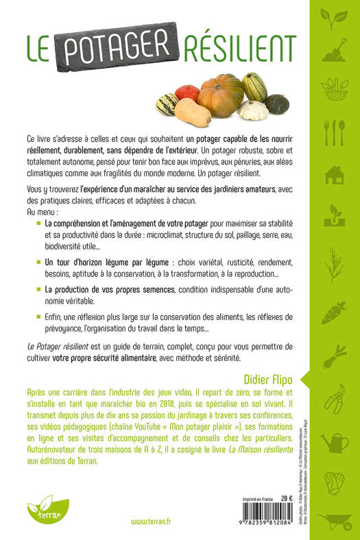 Ce livre s’adresse à celles et ceux qui souhaitent un potager capable de les nourrir réellement, durablement, sans dépendre de l’extérieur. Un potager robuste, sobre et totalement autonome, pensé pour tenir bon face aux imprévus, aux pénuries, aux aléas climatiques comme aux fragilités du monde moderne. Un potager résilient. Vous y trouverez l’expérience d’un maraîcher au service des jardiniers amateurs, avec des pratiques claires, efficaces et adaptées à chacun. Au menu : la compréhension et l’aménagement de votre potager pour maximiser sa stabilité et sa productivité dans la durée (microclimat, structure du sol, paillage, serre, eau, biodiversité utile…) ; un tour d’horizon légume par légume (choix variétal, rusticité, rendement, besoins, aptitude à la conservation, à la transformation, à la reproduction…) ; la production de vos propres semences, condition indispensable d’une autonomie véritable ; enfin, une réflexion plus large sur la conservation des aliments, les réflexes de prévoyance, l’organisation du travail dans le temps… Le Potager résilient est un guide de terrain, complet, conçu pour vous permettre de cultiver votre propre sécurité alimentaire, avec méthode et sérénité.