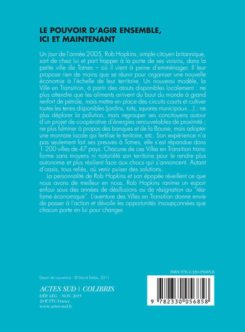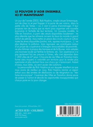 Un jour de l'année 2005, Rob Hopkins, simple citoyen britannique, sort de chez lui et part frapper à la porte de ses voisins, dans la petite ville de Totnes - où il vient à peine d'emménager. Il leur propose rien de moins que se réunir pour organiser une nouvelle économie à l'échelle de leur territoire. Un nouveau modèle, la Ville en Transition, à partir des atouts disponibles localement : ne plus attendre que les aliments arrivent du bout du monde à grand renfort de pétrole, mais mettre en place des circuits courts et cultiver toutes les terres disponibles (jardins, toits, squares municipaux...) ; ne plus déplorer la pollution, mais regrouper ses concitoyens autour d'un projet de coopérative d'énergies renouvelables de proximité ; ne plus fulminer à propos des banques et de la Bourse, mais adopter une monnaie locale qui fertilise le territoire, etc. Son expérience n'a pas seulement fait ses preuves à Totnes, elle s'est répandue dans 1 200 villes de 47 pays. Chacune de ces Villes en Transition transforme sans moyens ni notoriété son territoire pour le rendre plus autonome et plus résilient face aux chocs qui s'annoncent. Autant d'oasis, tous reliés, où venir puiser des solutions.