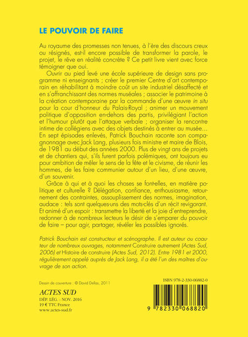 Au royaume des promesses non tenues, à l'ère des discours creux ou résignés, est-il encore possible de transformer la parole, le projet, le rêve en réalité concrète ? Ce petit livre vient avec force témoigner que oui. Ouvrir au pied levé une école supérieure de design sans programme ni enseignants ; créer le premier Centre d'art contemporain en réhabilitant à moindre coût un site industriel désaffecté et en s'affranchissant des normes muséales ; associer le patrimoine à la création contemporaine par la commande d'une oeuvre in situ pour la cour d'honneur du Palais-Royal ; animer un mouvement politique d'opposition en-dehors des partis, privilégiant l'action et l'humour plutôt que l'attaque verbale ; organiser la rencontre intime de collégiens avec des objets destinés à entrer au musée... En sept épisodes enlevés, Patrick Bouchain raconte son compagnonnage avec Jack Lang, plusieurs fois ministre et maire de Blois, de 1981 au début des années 2000. Plus de vingt ans de projets et de chantiers qui, s'ils furent parfois polémiques, ont toujours eu pour ambition de mêler le sens de la fête et le civisme, de réunir les hommes, de les faire communier autour d'un lieu, d'une oeuvre, d'un souvenir. Grâce à qui et à quoi les choses se font-elles, en matière politique et culturelle ? Délégation, confiance, enthousiasme, retournement des contraintes, assouplissement des normes, imagination, audace : tels sont quelques-uns des mots-clés d'un récit revigorant. Et animé d'un espoir : transmettre la liberté et la joie d'entreprendre, redonner à de nombreux lecteurs le désir de s'emparer du pouvoir de faire - pour agir, partager, révéler les possibles ignorés.