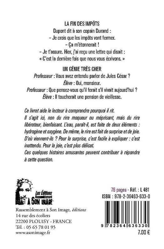 LA FIN DES IMPÔTS : Dupont dit à son copain Durand :Je crois que les impôts vont fermer. Ça m'étonnerait ! Je t'assure. Hier, j'ai reçu une lettre qui disait : « C'est la dernière fois que nous vous écrivons. » UN GÉNIE TRÈS CHER : Professeur : Vous avez entendu parler de Jules César ? Élève : Oui, monsieur.Professeur : Que pensez-vous qu'il ferait s'il vivait aujourd'hui ? Élève : Il toucherait une pension de vieillesse. Ce livret aide le lecteur à comprendre pourquoi il ritIl s'agit ici, non du rire moqueur ou méprisant, mais du rire libérateur, bienfaisant. L'eau, paraît-il, est faite de deux éléments : hydrogène et oxygène. De même, le rire est fait de surprise et de joie. D'où viennent-ils ? Pour la surprise, c'est facile à expliquer : c'est inattendu. Pour la joie, c'est plus délicat.Ces quelques histoires amusantes peuvent contribuer à répondre à cette question.