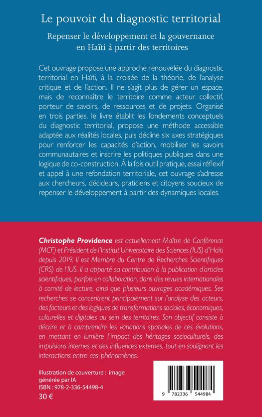 Cet ouvrage propose une approche renouvelée du diagnostic territorial en Haïti, à la croisée de la théorie, de l'analyse critique et de l'action. Il ne s'agit plus de gérer un espace, mais de reconnaître le territoire comme acteur collectif, porteur de savoirs, de ressources et de projets. Organisé en trois parties, le livre établit les fondements conceptuels du diagnostic territorial, propose une méthode accessible adaptée aux réalités locales, puis décline six axes stratégiques pour renforcer les capacités d'action, mobiliser les savoirs communautaires et inscrire les politiques publiques dans une logique de co-construction. À la fois outil pratique, essai réflexif et appel à une refondation territoriale, cet ouvrage s'adresse aux chercheurs, décideurs, praticiens et citoyens soucieux de repenser le développement à partir des dynamiques locales.