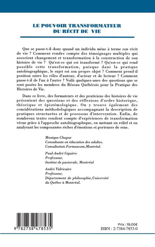 Que se passe-t-il donc quand un individu mène à terme son récit de vie ? Comment rendre compte des témoignages multiples qui associent changement et transformation à la construction de son histoire de vie ? Comment prend-il position entre les rôles d'auteur, d'acteur et de lecteur ? Dans ce livre, des formateurs et des praticiens des histoires de vie présentent des questions et des réflexions d'ordre historique, théorique et épistémologique.