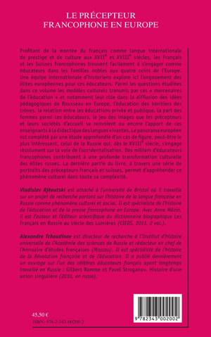 Une équipe internationale d'historiens explore ici l'engouement des élites européennes pour les éducateurs francophones. Parmi les questions étudiées dans ce volume les modèles culturels transmis par ces « mercenaires de l'éducation », leur rôle dans la diffusion des idées pédagogiques de Rousseau en Europe, l'éducation des héritiers des trônes, la part des femmes parmi ces éducateurs, le jeu des images que les précepteurs et leurs sociétés d'accueil se renvoient... Le panorama européen est complété par une étude approfondie d'un cas de figure, peut-être le plus intéressant, celui de la Russie