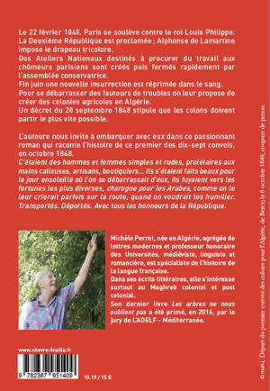 Le 22 février 1848, Paris se soulève contre le roi Louis Philippe. La Deuxième République est proclamée ; Alphonse de Lamartine impose le drapeau tricolore. Des Ateliers Nationaux destinés à procurer du travail aux chômeurs parisiens sont créés puis fermés rapidement par l’assemblée conservatrice. Fin juin une nouvelle insurrection est réprimée dans le sang. Pour se débarrasser des fauteurs de troubles on leur propose de créer des colonies agricoles en Algérie. Un décret du 20 septembre 1848 stipule que les colons doivent partir le plus vite possible. L’auteure nous invite à embarquer avec eux dans ce passionnant roman qui raconte l’histoire de ce premier des dix-sept convois, en octobre 1848. "C’étaient des hommes et femmes simples et rudes, prolétaires aux mains calleuses, artisans, boutiquiers… Ils s’étaient faits beaux pour le jour ensoleillé où l’on se débarrassait d’eux, ils fuyaient vers les fortunes les plus diverses, charogne pour les Arabes, comme on le leur crierait parfois sur la route, quand on voudrait les humilier. Transportés. Déportés. Avec tous les honneurs de la République."