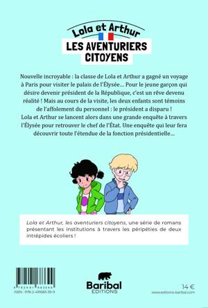 Nouvelle incroyable : la classe de Lola et Arthur a gagné un voyage à Paris pour visiter le palais de l’Élysée… Pour le jeune garçon qui désire devenir président de la République, c’est un rêve devenu réalité ! Mais au cours de la visite, les deux enfants sont témoins de l’affolement du personnel : le président a disparu ! Lola et Arthur se lancent alors dans une grande enquête à travers l’Élysée pour retrouver le chef de l’État. Une enquête qui leur fera découvrir toute l’étendue de la fonction présidentielle… Lola et Arthur, les aventuriers citoyens, une série de romans présentant les institutions à travers les péripéties de deux intrépides écoliers !