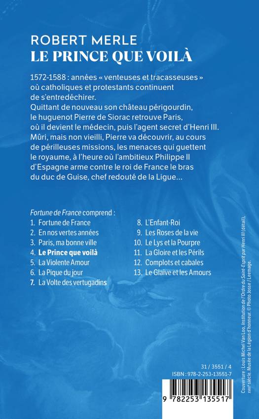 1572-1588: années «venteuses et tracasseuses» où catholiques et protestants continuent de s'entredéchirer. Quittant de nouveau son château périgourdin, le huguenot Pierre de Siorac retrouve Paris où il devient le médecin, puis l'agent secret d'Henri III. Mûri, mais non vieilli, Pierre va découvrir, au cours de périlleuses missions, les menaces qui guettent le royaume, à l'heure où l'ambitieux Philippe II d'Espagne, mettant à profit nos discordes, arme contre le roi de France le bras du duc de Guise, chef redouté de la Ligue... Tableau saisissant d'un roi au milieu de ses grands féaux, des « quarante-cinq » qui le protègent contre les dagues, du Paris fanatique et rebelle qui le chassera du trône, Le Prince que voilà nous mène parmi les complots, les rivalités, les intrigues qui semblent bien devoir anéantir la « fortune de France ». Pourtant ni l'amitié ni le bonheur de vivre ne perdent leurs droits. Ni l'entrain inépuisable et fécond d'un romancier plus captivant que jamais.