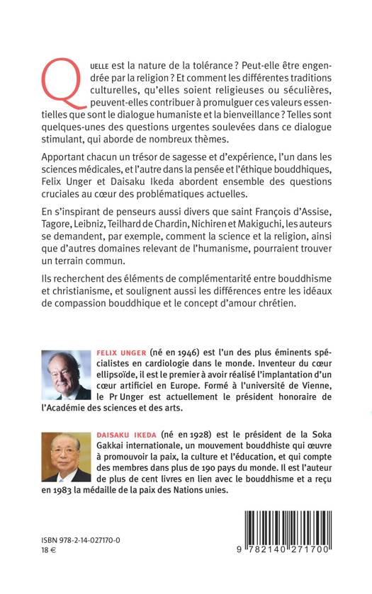 Quelle est la nature de la tolérance ? Peut-elle être engendrée par la religion ? Et comment les différentes traditions culturelles, qu’elles soient religieuses ou séculières, peuvent-elles contribuer à promulguer ces valeurs essentielles que sont le dialogue humaniste et la bienveillance ? Telles sont quelques-unes des questions urgentes soulevées dans ce dialogue stimulant, qui aborde de nombreux thèmes.Apportant chacun un trésor de sagesse et d’expérience, l’un dans les sciences médicales, et l’autre dans la pensée et l’éthique bouddhiques, Felix Unger et Daisaku Ikeda abordent ensemble des questions cruciales au coeur des problématiques actuelles. En s’inspirant de penseurs aussi divers que saint François d’Assise, Tagore, Leibniz, Teilhard de Chardin, Nichiren et Makiguchi, les auteurs se demandent, par exemple, comment la science et la religion, ainsi que d’autres domaines relevant de l’humanisme, pourraient trouver un terrain commun.Ils recherchent des éléments de complémentarité entre bouddhisme et christianisme, et soulignent aussi les différences entre les idéaux de compassion bouddhique et le concept d’amour chrétien.