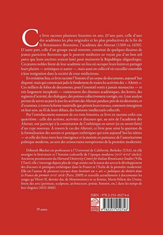 Ce livre raconte plusieurs histoires en une. D'une part, celle d'une des academies les plus originales et les plus productives de la fin de la Renaissance florentine, l'academie des Alterati (1569-ca. 1630). D'autre part, celle d'un groupe social restreint, constitue de quelques dizaines de jeunes patriciens florentins que le pouvoir mediceen ne voyait pas d'un bon oeil parce que leurs ancetres avaient lutte pour maintenir la Republique oligarchique. Ces jeunes nobles firent de leur academie un lieu ou occuper leurs loisirs et partager leurs plaisirs - artistiques et autres -, mais aussi un collectif ou travailler ensemble a leur integration dans la societe de cour mediceenne. En troisieme lieu, ce livre raconte l'histoire d'un corpus de documents, aujourd'hui disperse, mais qui constituait jadis le fondement de toutes les activites des Alteres . Ces milliers de folios de documents, pour l'essentiel restes a jamais manuscrits - et tres largement inexplores - contiennent des discours academiques, des lettres, des registres d'activite, des dialogues, des poemes collectivement corriges, etc. Leur analyse permet de suivre au jour le jour les activites des Alterati pendant pres de six decennies, et d'examiner, a travers la forme materielle que prirent leurs travaux, comment emergerent en leur sein, au fil de leurs debats, des horizons intellectuels collectifs. Par l'entrelacement constant de ces trois histoires, ce livre en raconte enfin une quatrieme: celle des actions, activites et discours qui, au sein de l'academie des Alterati, ont participe a la constitution de l'esthetique en savoir (et en savoir-faire) d'un type nouveau. A travers le cas des Alterati, ce livre pose ainsi la question de la formalisation des savoirs et pratiques esthetiques qui sont aujourd'hui les notres - et celle des liens entre leur emergence et la montee en puissance de l'autoritarisme politique moderne, au sein des aristocraties europeennes de la premiere modernite.