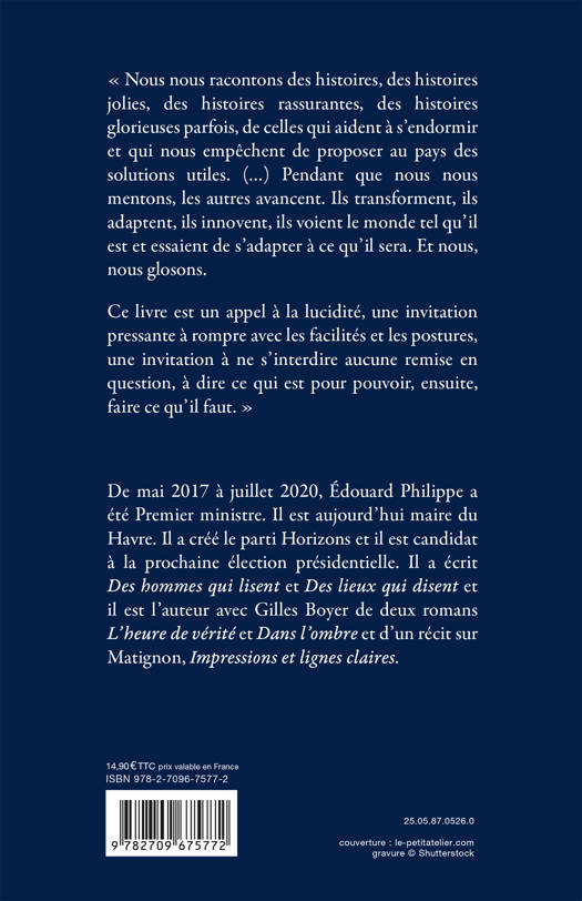 Nous nous racontons des histoires, des histoires jolies, des histoires rassurantes, des histoires glorieuses parfois, de celles qui aident à s’endormir et qui nous empêchent de proposer au pays des solutions utiles. (…) Pendant que nous nous mentons, les autres avancent. Ils transforment, ils adaptent, ils innovent, ils voient le monde tel qu’il est et essaient de s’adapter à ce qu’il sera. Et nous, nous glosons.