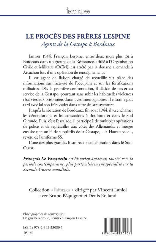Janvier 1944, François Lespine, entré deux mois plus tôt à Bordeaux dans un groupe de la Résistance, affilié à l'Organisation Civile et Militaire (OCM), est arrêté par la douane allemande à Arcachon lors d'une opération de renseignements. Agent de liaison chargé de recueillir sur place des informations sur l'activité de l'occupant, il décide pourtant de passer au service de la Gestapo. Il entraine plus tard avec lui son frère cadet dans cette sinistre aventure. Jusqu'à la libération de Bordeaux, fin aout 1944, il enchaîne les dénonciations et les arrestations à Bordeaux et dans le sud Gironde. Il participe à de multiples opérations de police et de représailles aux côtés des Allemands, et intègre une unité de supplétifs de la gestapo, - la Hauskapelle -, revêtu de l'uniforme SS. L'une des plus grandes histoires de collaboration dans le Sud-Ouest.