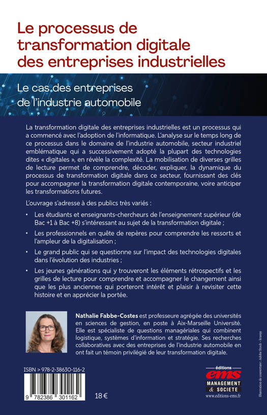 La transformation digitale des entreprises industrielles est un processus qui a commencé avec l’adoption de l’informatique. L’analyse sur le temps long de ce processus dans le domaine de l’industrie automobile, secteur industriel emblématique qui a successivement adopté la plupart des technologies dites « digitales », en révèle la complexité. La mobilisation de diverses grilles de lecture permet de comprendre, décoder, expliquer, la dynamique du processus de transformation digitale dans ce secteur, fournissant des clés pour accompagner la transformation digitale contemporaine, voire anticiper les transformations futures.
