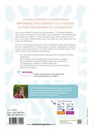 Suivez la neuropsychologue Cathy Assenheim dans les 4 étapes de son programme sur mesure pour évaluer rapidement votre situation, puis reprendre le contrôle. Grâce à ce guide perso, vous retrouverez votre énergie et réduirez :