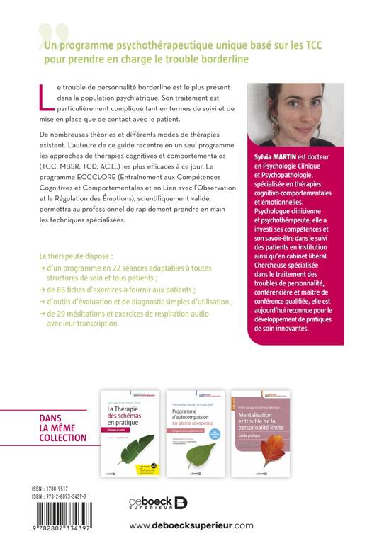 Le trouble de personnalité borderline est le plus présent dans la population psychiatrique. Son traitement est particulièrement compliqué tant en termes de suivi et de mise en place que de contact avec le patient. De nombreuses théories et différents modes de thérapies existent. L’auteure de ce guide recentre en un seul programme les approches de thérapies cognitives et comportementales (TCC, MBSR, TCD, ACT...) les plus efficaces à ce jour. Le programme ECCCLORE (Entraînement aux Compétences Cognitives Comportementales et en Lien avec l’Observation et la Régulation des Émotions), scientifiquement validé, permettra au professionnel de rapidement prendre en main les techniques spécialisées. Le thérapeute dispose : • d’un protocole de 22 séances adaptables à toutes structures de soin et patients ; • du matériel de base pour lancer des ateliers ; • de fiches d’exercices à imprimer pour les patients ; • d’outils d’évaluation et de diagnostic simples d’utilisation ; • de contenus audio (pistes de méditation, exercices de respiration).