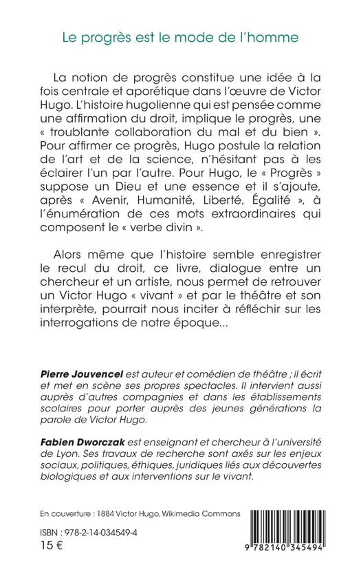 La notion de progrès constitue une idée à la fois centrale et aporétique dans l'oeuvre de Victor Hugo. L'histoire hugolienne qui est pensée comme une affirmation du droit, implique le progrès, une troublante collaboration du mal et du bien . Pour affirmer ce progrès, Hugo postule la relation de l'art et de la science, n'hésitant pas à les éclairer l'un par l'autre. Pour Hugo, le Progrès suppose un Dieu et une essence et il s'ajoute, après Avenir, Humanité, Liberté, Égalité, à l'énumération de ces mots extraordinaires qui composent le verbe divin . Alors même que l'histoire semble enregistrer le recul du droit, ce livre, dialogue entre un chercheur et un artiste, nous permet de retrouver un Victor Hugo vivant et par le théâtre et son interprète, pourrait nous inciter à réfléchir sur les interrogations de notre époque...