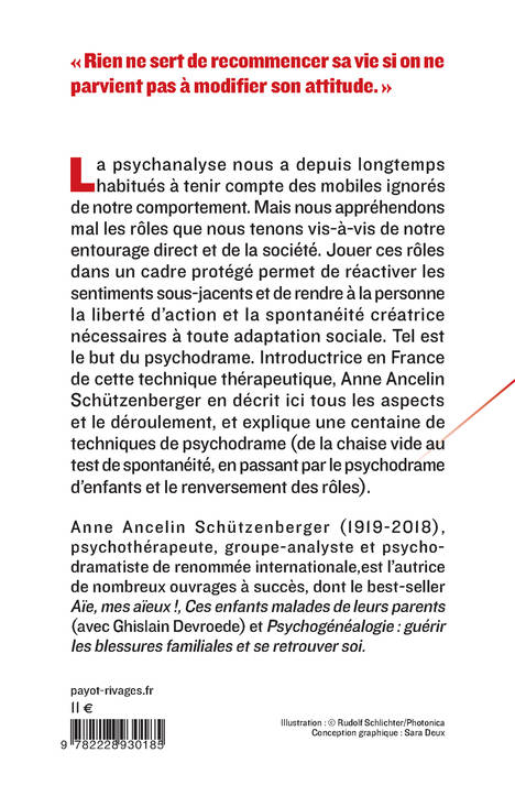 La psychanalyse nous a depuis longtemps habitués à tenir compte des mobiles ignorés de notre comportement. Mais nous appréhendons mal les rôles que nous tenons vis-à-vis de notre entourage direct et de la société. Jouer ces rôles dans un cadre protégé permet de réactiver les sentiments sous-jacents et de rendre à la personne la liberté d'action et la spontanéité créatrice nécessaires à toute adaptation sociale. Tel est le but du psychodrame. Introductrice en France de cette technique thérapeutique, Anne Ancelin Schützenberger en décrit ici tous les aspects et le déroulement, et explique une centaine de techniques de psychodrame (de la chaise vide au test de spontanéité, en passant par le psychodrame d'enfants et le renversement des rôles).