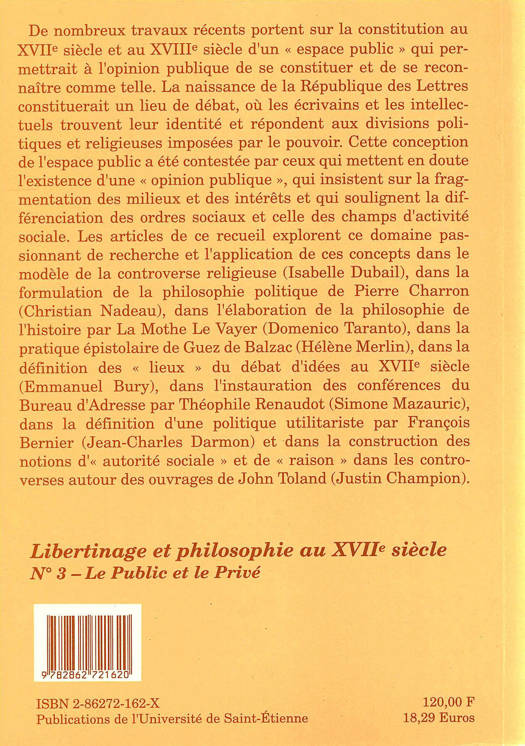 Traite de la constitution au XVIIe et au XVIIIe siècle d'un espace public qui permettrait à l'opinion publique de se reconnaître. La naissance de la République des lettres constituerait un lieu de débat, où les écrivains et les intellectuels trouveraient leur identité et répondraient aux divisions politiques et religieuses imposées par le pouvoir.