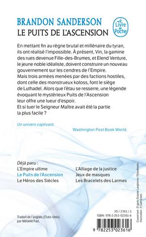 En mettant fin au règne brutal et millénaire du tyran, ils ont réalisé l’impossible. À présent, Vin la gamine des rues devenue Fille-des-Brumes, et Elend Venture le jeune noble idéaliste, doivent construire un nouveau gouvernement sur les cendres de l’Empire. Mais trois armées menées par des factions hostiles, dont celle des monstrueux koloss, font le siège de Luthadel. Alors que l’étau se resserre, une légende évoquant le mystérieux Puits de l’Ascension leur offre une lueur d’espoir. Et si tuer le Seigneur Maître avait été la partie la plus facile ?