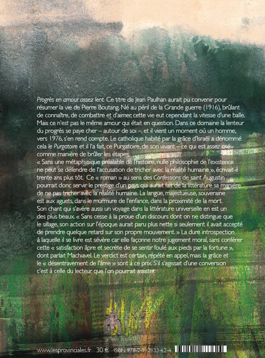 Cette nouvelle édition du Purgatoire de Pierre Boutang, d'abord paru en 1976, est présentée avec délicatesse et suffisamment d'érudition par Ghislain Chaufour, qui assume de manière tout à fait convaincante les qualificatifs que nous avons voulu relever depuis vingt ans : catholique, nationaliste, sioniste. Elle se trouve copieusement annotée : mille cinquante notes presque de musique donnent les ressources de ce texte étourdissant, citent de nombreux fragments ou poèmes que l'auteur avait tout près dans sa mémoire, et avec sa vigoureuse préface, affrontent et résolvent une à une de nombreuses difficultés (presque toutes) - un exploit, si l'on songe notamment à celles qui touchent à la condamnation de l'usure (bien après Ezra Pound qui fut placé pour cela dans une cage de fer) et à l'antisémitisme « ordinaire », ou bien à cette parodie de séance d'inspection de l'Éducation nationale décrite à la manière de Ionesco (et Novarina), où le ré-agrégé - qui n'était pas dans sa première jeunesse puisque il avait été radié sans motif connu pendant vingt ans (1945-1967) -, reprend sa leçon interrompue par l'Inquisition d'alors avec les mots de Luis de Léon : « Diciamos ayer... Nous disions hier... » (1576.) AUTEUR Philosophe, théoricien politique et romancier, homme de la trempe d'un Jünger, Pierre Boutang (1916-1998) fonda et dirigea de 1955 à 1967 La Nation Française, hebdomadaire dans lequel il écrivit chaque semaine ses « Politiques ». Puis il publia notamment Ontologie du secret (1973), Le Purgatoire (1976), Reprendre le pouvoir (1978), Maurras, la destinée et l'Åuvre (1984) et succéda à Emmanuel Levinas à la chaire de métaphysique de la Sorbonne en 1976. « L'un des plus grands esprits de ce siècle » (Le Figaro), « auteur d'une Åuvre multiforme et tempétueuse... d'une force de conviction et cohérence peu communes, et d'une imprudence qui se souciait peu des modes » (Le Monde).