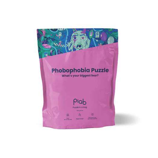 Puzzel 1000 stuks, Belgisch concept, getekend door 4 studenten van de Arteveldehogeschool. Durf jij je angsten onder ogen te zien? Met de nieuwste puzzel van Puzzle in a Bag dagen we je uit om meer dan 70 verschillende fobieën te ontdekken in een prachtig design. Van anthofobie (angst voor bloemen) tot wiccafobie (angst voor heksen), elke puzzelstuk onthult een nieuwe vrees.