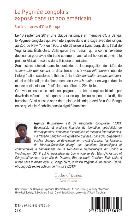 Le 16 septembre 2017, une plaque historique en mémoire d'Ota Benga, le Pygmée congolais qui avait été exposé dans une cage avec des singes au Zoo de New York en 1906, a été dévoilée à Lynchburg, dans l'état de Virginia aux États-Unis. Voilà qu'un être humain qui a connu l'extrême déchéance pour avoir été traité comme un animal est honoré et devient le premier Africain reconnu dans l'histoire américaine. Son histoire s'inscrit dans le contexte de la propagation de l'idée de « hiérarchie des races » et est emblématique du phénomène de « zoos humains » en vogue dans le monde occidental au 19e siècle et au début du 20e siècle. Ce livre expose cette curieuse, poignante et très complexe histoire par devoir de mémoire historique et pour en appeler au respect de la dignité humaine.