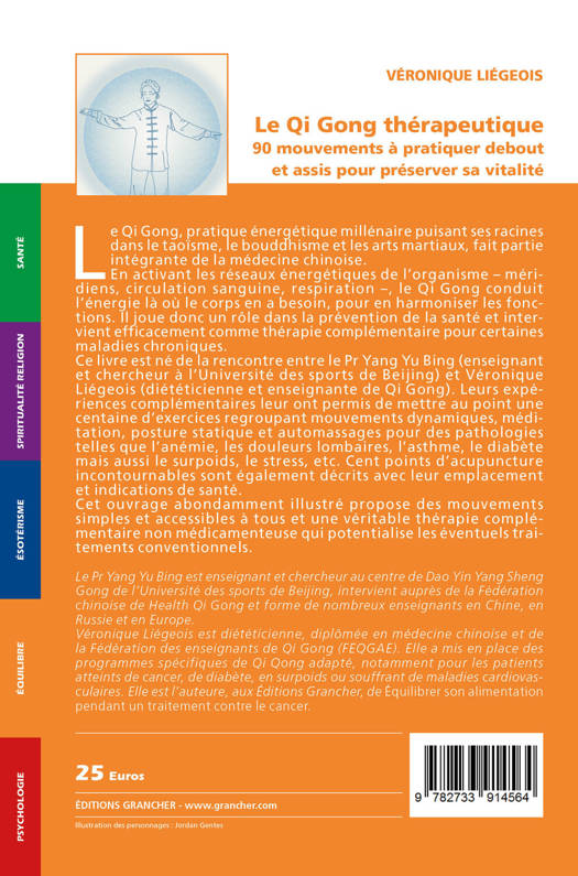 Pratique énergétique millénaire, le Qi Gong fait partie intégrante de la médecine chinoise. Il joue un rôle dans la prévention de la santé et est considéré comme l’une des meilleures activités anti-âge. Les mobilisations douces des articulations facilitent la circulation du Qi, les rendant plus mobiles. La lenteur des mouvements favorise une respiration calme, sans augmentation du rythme cardiaque ni essoufflement tout en induisant un renforcement musculaire. Le Qi Gong apaise les douleurs corporelles, améliore l’équilibre et est particulièrement reconnu pour son impact positif sur certaines pathologies comme le diabète, l’hypertension artérielle, les maladies cardiovasculaires, les lombalgies, les états dépressifs, la fatigue et les maladies neurodégénératives (Alzheimer, Parkinson, sclérose en plaques…). Dans cet ouvrage richement illustré, vous trouverez des exercices simples à pratiquer debout ou assis. La grande diversité de mouvements proposés vous permettra de choisir selon vos envies et vos possibilités. Pratiquer régulièrement le Qi Gong ne vous empêchera pas de vieillir, mais vous permettra de vivre mieux et en meilleure santé. Une méthode tout en douceur pour ajouter de la vie aux années !