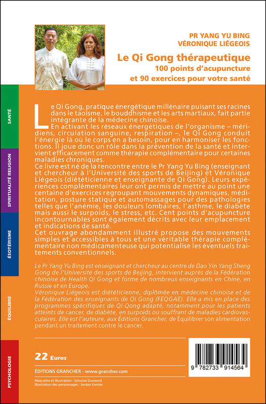 Le Qi Gong, pratique énergétique millénaire puisant ses racines dans le taoïsme, le bouddhisme et les arts martiaux, fait partie intégrante de la médecine chinoise, au même titre que l’acupuncture, le massage, la diététique et la pharmacopée. En activant les réseaux énergétiques de l’organisme - méridiens, circulation sanguine, respiration -, le Qi Gong conduit l’énergie là où le corps en a besoin, pour en harmoniser les fonctions. Il joue doncun rôle dans la prévention de la santé et intervient efficacement comme thérapie complémentaire pour certaines maladies chroniques. Ce livre est né de la rencontre entre le professeur Yang Yu Bing (enseignant et chercheur à l’université des sports de Beijing) et Véronique Liégeois (diététicienne et enseignante de Qi Gong). Leurs expériences complémentaires leur ont permis de mettre au point une centaine d’exercices basés sur les principes de la médecine chinoise et regroupant mouvements dynamiques, méditation, posture statique et automassages pour des pathologies telles que l’anémie, les douleurs lombaires, l’asthme, le diabète mais aussi le surpoids, le stress, etc. Cent points d’acupuncture incontournables sont également décrits avec leur emplacement et indications de santé. Cet ouvrage abondamment illustré propose des mouvements simples et accessibles à tous et propose une véritable thérapie complémentaire non médicamenteuse qui potentialise les éventuels traitements conventionnels.