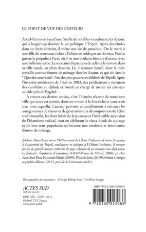 Abdel-Karim est issu d'une famille de notables musulmans, les Azzâm, qui a longtemps dominé la vie politique à Tripoli. Après des études dans un lycée chrétien, il mène une vie de patachon. On le marie à une fille de nouveaux riches ; l'affaire se solde par un divorce. Puis la guerre le propulse à Paris, où il vit une brûlante histoire d'amour avec une ballerine serbe. La soudaine disparition de celle-ci le renvoie dans sa ville natale, en plein désarroi. Là, il retrouve Ismaïl, dont la mère travaille comme femme de ménage chez les Azzâm, et qui vit dans le "Quartier américain", l'un des plus pauvres et délabrés de Tripoli. Après l'invasion américaine de l'Irak en 2003, des prédicateurs y recrutent des candidats au djihad, et Ismaïl est chargé de mener un attentat-suicide près de Bagdad...