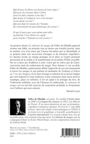Au premier abord, Le raboteur de nuages de Gilles de Obaldia apparaît comme une fable...mais sa matière vive n'est autre que l'auteur lui même qui se démultiplie et se projette dans une succession d'images et de lumières singulières. Il révèle un champ poétique où le désir et l'esprit prennent possession de la réalité et la transforment en un jardin d'Eden croyable. Il est étrange et salutaire de se laisser happer par la vision de l'auteur, par cette légèreté et cette tendresse si peu communes dans notre univers sceptique, glacé ou utilitaire...Cet ouvrage est un bel exercice de respiration profonde et d'aspiration vers l'ailleurs qui nous entoure.