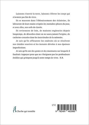 L'EXTRAIT « Laissons s’ouvrir la terre, laissons s’élever les corps qui n’avaient pas fini de vivre. Ils se massent dans l’éblouissement des éclaircies, ils labourent de leurs mains crispées les moindres pliures du jour, et avec elles, nos soifs de clartés. Ils reviennent de loin, de maisons englouties depuis longtemps, de désordres dont on ne saura jamais l’origine, de cachettes creusées dans les incertitudes de la mémoire. Je sais qu’ils effleurent les endroits où se résolvent nos timides sourires et les instants dévolus à nos épaisses imperfections. Je sais qu’ils ont des gestes et des murmures sur lesquels il faudrait s’appuyer pour que ne s’éteignent pas les profondeurs étoilées qui grimpent jusqu’à notre temps de vivre. »