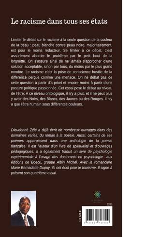 Limiter le débat sur le racisme à la seule question de la couleur de la peau : peau blanche contre peau noire, majoritairement, est pour le moins réducteur. Se limiter à ce débat, c'est assurément aborder le problème par le petit bout de la lorgnette. On s'assure ainsi de ne jamais s'approcher d'une solution acceptable, sinon par tous, du moins par le plus grand nombre. Le racisme c'est la prise de conscience hostile de la différence perçue comme une menace. On ne débat pas de cette question à partir d'a priori et encore moins à partir d'une posture politique passionnée. Cet essai pose le débat au niveau de l'être. À ce niveau ontologique, il n'y a plus, et il ne peut plus y avoir des Noirs, des Blancs, des Jaunes ou des Rouges. Il n'y a que l'être humain sous différentes couleurs.