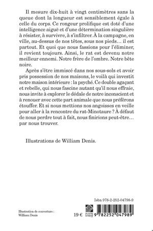 Il mesure dix-huit a vingt centimetres sans la queue dont la longueur est sensiblement egale a celle du corps. Ce rongeur prolifique est dote d'une intelligence aigue et d'une determination singuliere a resister, a survivre, a s'infiltrer. A la campagne, en ville, au-dessus de nos tetes, sous nos pieds... il est partout. Et quoi que nous fassions pour l'eliminer, il revient toujours. Ainsi, le rat est devenu notre meilleur ennemi. Notre frere de l'ombre. Notre bete noire. Apres s'etre immisce dans nos sous-sols et avoir pris possession de nos maisons, le voila qui investit notre maison interieure: la psyche. Ce double agacant et rebelle, qui nous fascine autant qu'il nous effraie, nous invite a explorer le dedale de notre inconscient et a renouer avec cette part animale que nous preferons etouffer. Et si nous mettions nos angoisses en veille pour aller a la rencontre du rat-Minotaure ? A defaut de nous perdre tout a fait, nous finirions peut-etre... par nous trouver.