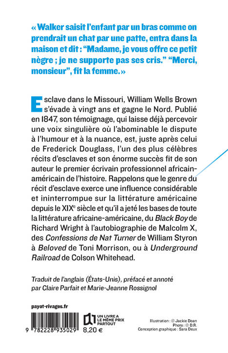 Esclave dans le Missouri, William Wells Brown s'évade à vingt ans et gagne le Nord. Publié en 1847, son témoignage, qui laisse déjà percevoir une voix singulière où l'abominable le dispute à l'humour et à la nuance, est, juste après celui de Frederick Douglass, l'un des plus célèbres récits d'esclaves et son énorme succès fit de son auteur le premier écrivain professionnel africain- américain de l'histoire. Rappelons que le genre du récit d'esclave exerce une influence considérable et ininterrompue sur la littérature américaine depuis le XIXe siècle et qu'il a jeté les bases de toute la littérature africaine-américaine, du "Black Boy" de Richard Wright à l'autobiographie de Malcolm X, des "Confessions de Nat Turner" de William Styron à "Beloved" de Toni Morrison, ou à "Underground Railroad" de Colson Whitehead.