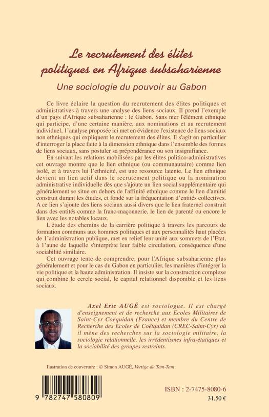 Ce livre éclaire la question du recrutement des élites politiques et administratives à travers une analyse des liens sociaux. Il tente de comprendre pour l'Afrique subsaharienne et pour le cas Gabon en particulier la manière d'intégrer la vie politique et la haute administration. Il insiste sur la construction complexe qui combine le cercle social, le capital relationnel disponible et les liens sociaux.