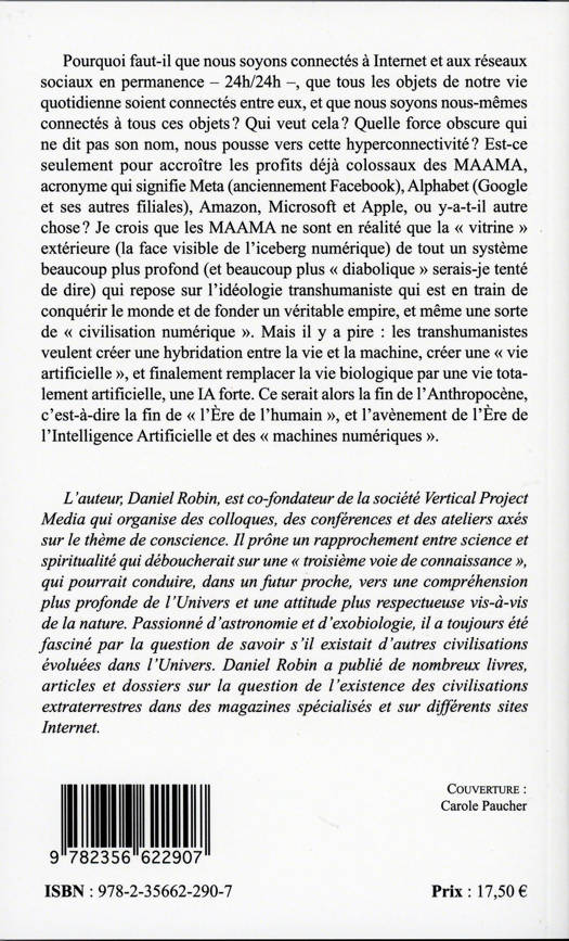 Pourquoi faut-il que nous soyons connectés à Internet et aux réseaux sociaux en permanence – 24h/24h –, que tous les objets de notre vie quotidienne soient connectés entre eux, et que nous soyons nous-mêmes connectés à tous ces objets ? Qui veut cela ? Quelle force obscure qui ne dit pas son nom, nous pousse vers cette hyperconnectivité ? Est-ce seulement pour accroître les profits déjà colossaux des MAAMA, acronyme qui signifie Meta (anciennement Facebook), Alphabet (Google et ses autres filiales), Amazon, Microsoft et Apple, ou y-a-t-il autre chose ? Je crois que les MAAMA ne sont en réalité que la « vitrine » extérieure (la face visible de l’iceberg numérique) de tout un système beaucoup plus profond (et beaucoup plus « diabolique » serais-je tenté de dire) qui repose sur l’idéologie transhumaniste qui est en train de conquérir le monde et de fonder un véritable empire, et même une sorte de « civilisation numérique ». Mais il y a pire : les transhumanistes veulent créer une hybridation entre la vie et la machine, créer une « vie artificielle », et finalement remplacer la vie biologique par une vie totalement artificielle, une IA forte. Ce serait alors la fin de l’Anthropocène, c’est-à-dire la fin de « l’Ere de l’humain », et l’avènement de l’Ère de l’Intelligence Artificielle et des « machines numériques ». Daniel Robin.