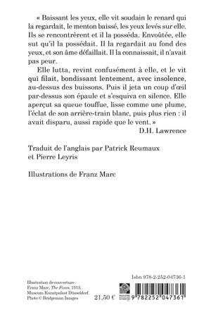 Ce recueil original de trois nouvelles, ecrites par l'auteur de L'Amant de Lady Chatterley, rassemble les themes de predilection du romancier: la critique d'une societe a la fois materialiste et puritaine et l'eloge des forces instinctives de la vie. Les elans irrepressibles qui animent les personnages font voler en eclats les carcans bien pensants de la societe britannique du debut du XXe siecle. Pour D.H. Lawrence, un corps doit battre comme un coeur, sous peine d'etre sacrifie sur l'autel des bonnes moeurs (comprenez des bons interets). Ces textes celebrent avec une plume eblouissante la puissance premiere et animale du corps, qui se fond dans une nature rendue a sa magnificence sauvage. Notre edition met en regard les nouvelles de D. H. Lawrence avec un choix d'une dizaine d'oeuvres du peintre expressionniste allemand Franz Marc, dans lesquelles l'animal et son espace vital sont representes avec les vibrations chromatiques intenses d'un monde essentiellement bon et beau - donc etranger a la societe des hommes. Baissant les yeux, elle vit soudain le renard qui la regardait, le menton baisse, les yeux leves sur elle. Ils se rencontrerent et il la posseda. Envoutee, elle sut qu'il la possedait. Il la regardait au fond des yeux, et son ame defaillait. Il la connaissait, il n'avait pas peur. Elle lutta, revint confusement a elle, et le vit qui filait, bondissant lentement, avec insolence, au-dessus des buissons. Puis il jeta un coup d'oeil par-dessus son epaule et s'esquiva en silence. Elle apercut sa queue touffue, lisse comme une plume, l'eclat de son arriere-train blanc, puis plus rien: il avait disparu, aussi rapide que le vent. D.H. Lawrence
