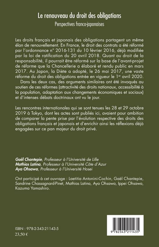 Cet ouvrage compare les droits français et japonais des obligations et leurs évolutions. En France, le droit des contrats a été réformé par l'ordonnance n° 2016-131 du 10 février 2016 et par la loi de ratification du 20 avril 2018. Quant au droit de la responsabilité, il pourrait être réformé sur la base de l'avant-projet de réforme de la Chancellerie (mars 2017). Au Japon, la Diète a adopté en 2017 une réforme du droit des obligations entrée en vigueur le 1er avril 2020. Dans les deux cas, des arguments similaires ont été invoqués (attractivité des droits nationaux, accessibilité à la population, adaptation aux changements économiques et sociaux) et d'intenses débats ont vu le jour.