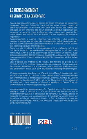 Face à la menace terroriste, la presse ne cesse d'évoquer les désormais tristement célèbres «fiches S», sans vraiment savoir à quoi correspond cette dénomination, ni le fichier dont elles sont issues. De même, des critiques se font entendre dès qu'un attentat terroriste se produit, reprochant aux services de sécurité d'être inefficaces, alors même que ceux-ci font correctement leur métier dans les limites que leur imposent le droit et le législateur. Paradoxalement, la crainte - légitime mais infondée - d'un excès de pouvoir accordé aux services de renseignement refait périodiquement surface, et des voix dénoncent une surveillance croissante portant atteinte aux libertés publiques et individuelles. Force est de constater la méconnaissance et la méfiance qu'ont les médias et le public des services de renseignement et de sécurité dans notre pays. Ainsi le but de cet ouvrage est de dresser un tableau aussi précis que possible des moyens dont disposent nos services, des actions que nos autorités et notre système législatif leur autorisent et des limites imposées. Les lecteurs y trouveront une présentation claire et exhaustive de sujets souvent survolés, méconnus ou mal compris. Qu'il s'agisse des méthodes de recueil, des fichiers de police ou de renseignement, du contrôle parlementaire des services, cet ouvrage fera référence et sera fort utile aux chercheurs, aux étudiants, à la presse, aux parlementaires, aux politiques et à tous ceux qui s'intéressent au renseignement franç
