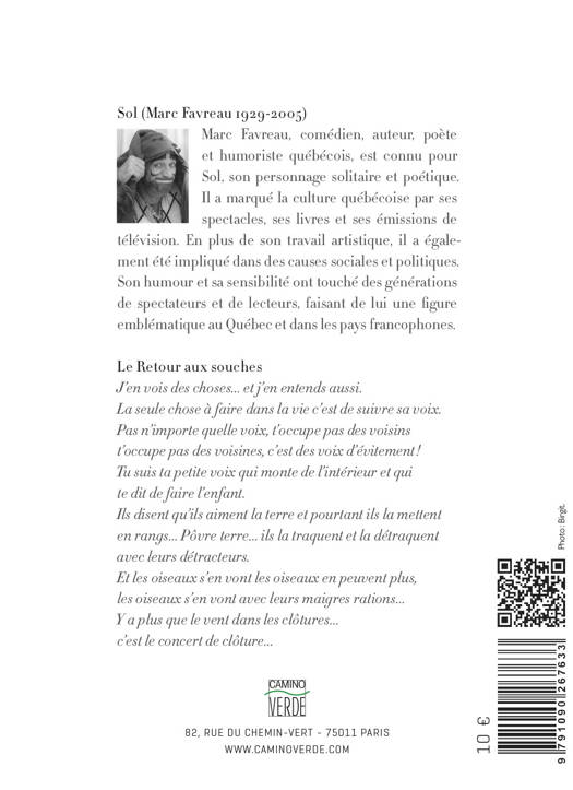 J’en vois des choses… et j’en entends aussi. La seule chose à faire dans la vie c’est de suivre sa voix. Pas n’importe quelle voix, t’occupe pas des voisins t’occupe pas des voisines, c’est des voix d’évitement ! Tu suis ta petite voix qui monte de l’intérieur et qui te dit de faire l’enfant. Ils disent qu’ils aiment la terre et pourtant ils la mettent en rangs… Pôvre terre… ils la traquent et la détraquent avec leurs détracteurs. Et les oiseaux s’en vont les oiseaux en peuvent plus, les oiseaux s’en vont avec leurs maigres rations… Y a plus que le vent dans les clôtures… c’est le concert de clôture…
