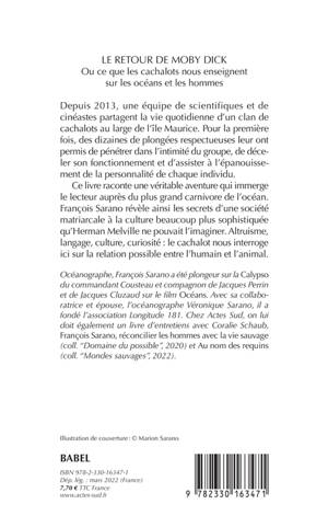 Depuis 2013, une équipe de scientifiques et de cinéastes partagent la vie quotidienne d'un clan de cachalots au large de l'île Maurice. Pour la première fois, des dizaines de plongées respectueuses leur ont permis de pénétrer dans l'intimité du groupe, de déceler son fonctionnement et d'assister à l'épanouissement de la personnalité de chaque individu. Ce livre raconte une véritable aventure qui immerge le lecteur auprès du plus grand carnivore de l'océan. François Sarano révèle ainsi les secrets d'une société matriarcale à la culture beaucoup plus sophistiquée qu'Herman Melville ne pouvait l'imaginer. Altruisme, langage, culture, curiosité : le cachalot nous interroge ici sur la relation possible entre l'humain et l'animal.
