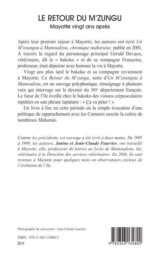 Ce Retour du M'zungu, suite d'Un M'zoungou à Mamoudzou, est un ouvrage polyphonique, témoignage à plusieurs voix qui interroge sur le devenir du 101e département français. À travers le regard du personnage principal Gérald Devaux, vétérinaire, dit le « bakoko » et de sa compagne Françoise, professeur, était dépeinte avec humour la vie à Mayotte. Vingt ans plus tard le bakoko et sa compagne reviennent sur l'île. Le futur de Mayotte éveille chez le bakoko des visions crépusculaires répétées en une phrase lapidaire : « Ça va péter ! »...