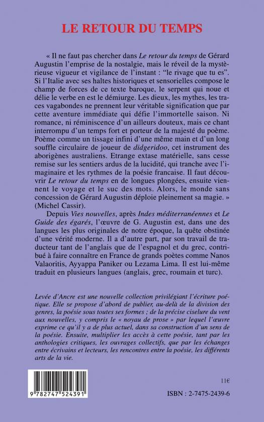 " Il ne faut pas chercher dans Le retour du temps de Gérard Augustin l'emprise de la nostalgie, mais le réveil de la mystérieuse vigueur et vigilance de l'instant. Si l'Italie avec ses haltes historiques et sensorielles compose le champ de forces de ce texte baroque, le serpent qui noue et délie le verbe en est le démiurge. Les dieux, les mythes, les traces vagabondes ne prennent leur véritable signification que par cette aventure immédiate qui défie l'immortelle saison. L'œuvre de Gérard Augustin est la quête obstinée d'une vérité moderne.