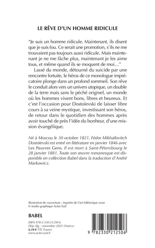 "Je suis un homme ridicule. Maintenant, ils disent que je suis fou. Ce serait une promotion, s'ils ne me trouvaient pas toujours aussi ridicule. Mais maintenant je ne me fâche plus, maintenant je les aime tous, et même quand ils se moquent de moi..." Lassé du monde, détourné du suicide par une rencontre fortuite, le héros de ce monologue imprécatoire plonge dans un profond sommeil. Son rêve le conduit alors vers un univers utopique, un double de la terre mais sans le péché originel, un monde où les hommes vivent bons, libres et heureux. Et c'est l'occasion pour Dostoïevski de laisser libre cours à sa veine mystique, investissant son héros, de retour dans le quotidien des hommes après avoir touché de près l'idée du bonheur, d'une mission évangélique.