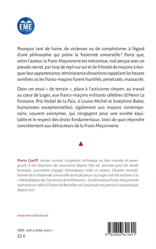 Qui dérangent-ils les francs-maçons ? Pourquoi fake news, campagnes dénigrantes, temples vandalisés, agressions physiques et morales à leur encontre ? L'auteur, franc-maçon depuis trente-cinq ans et activiste pour les droits fondamentaux depuis Mai 68, décrit, exemples concrets à l'appui, des causes inhérentes à cette situation rappelant les heures sombres du totalitarisme. Par son vécu sur le terrain, il développe des solutions crédibles, non utopistes, pour bâtir une société humaniste et une fraternité universelle.