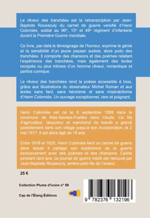 Le rêveur des tranchées est la retranscription par Jean-Baptiste Roussouly du carnet de guerre versifié d’Henri Colomiés, soldat au 96e, 15e et 49e régiment d’infanterie durant la Première Guerre mondiale. Ce livre, par-delà le témoignage de l’horreur, exprime le génie et la sensibilité d’un jeune paysan audois, alors poilu des tranchées. Il comporte des chansons et des poèmes relatant l’expérience des tranchées, mais également des textes recopiés ou plus intimes d’un homme rêveur, romantique et parfois comique. Le rêveur des tranchées rend la poésie accessible à tous, grâce aux illustrations du dessinateur Michel Roman et aux textes sans fard, sans héroïsme et sans misérabilisme d’Henri Colomiés. Un ouvrage exceptionnel, rare et poignant.