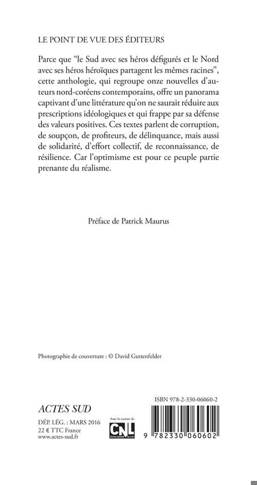 Parce que "le Sud avec ses héros défigurés et le Nord avec ses héros héroïques partagent les mêmes racines", cette anthologie, qui regroupe onze nouvelles d'auteurs nord-coréens contemporains, offre un panorama captivant d'une littérature qu'on ne saurait réduire aux prescriptions idéologiques et qui frappe par sa défense des valeurs positives. Ces textes parlent de corruption, de soupçon, de profiteurs, de délinquance, mais aussi de solidarité, d'effort collectif, de reconnaissance, de résilience. Car l'optimisme est pour ce peuple partie prenante du réalisme.